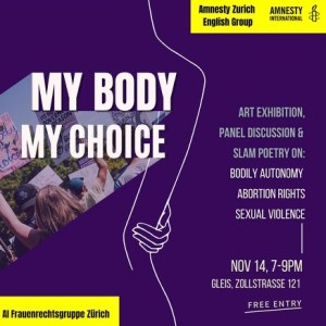 Kunstausstellung, Podiumsdiskussion und Slam Poetry zu körperlicher Selbstbestimmung, Abtreibung und sexualisierter Gewalt von der Amnesty Zurich English Group und der Frauenrechtsgruppe Zürich.